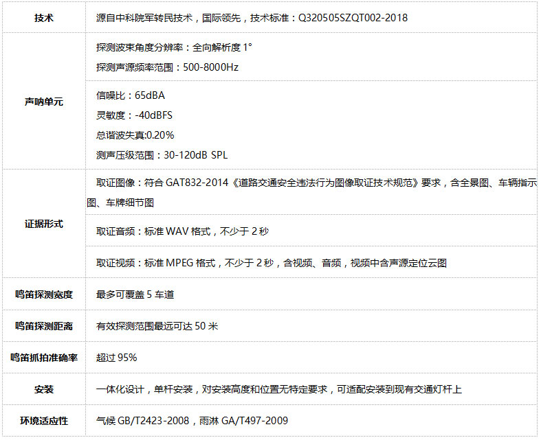 清聽聲學(xué)研發(fā)生產(chǎn)的違法鳴笛炸街抓拍系統(tǒng)已通過公安部權(quán)威檢測認(rèn)證,并協(xié)助中科院聲學(xué)所制定行業(yè)規(guī)范。清聽聲學(xué)違法鳴笛炸街抓拍系統(tǒng)以國際先進的聲源定位技術(shù)為核心,以清聽聲學(xué)創(chuàng)新研發(fā)的波達(dá)方向定位技術(shù)、波束形成技術(shù)、自動噪音抑制技術(shù)為基礎(chǔ),對現(xiàn)有道路交通執(zhí)法系統(tǒng)進行全面科技化、數(shù)字化升級,形成從數(shù)據(jù)采集、存儲、分析到執(zhí)法提升的“綠色交通”閉環(huán),提供完整的端 (采集終端)到端(執(zhí)行終端)的智能應(yīng)用解決方案。
